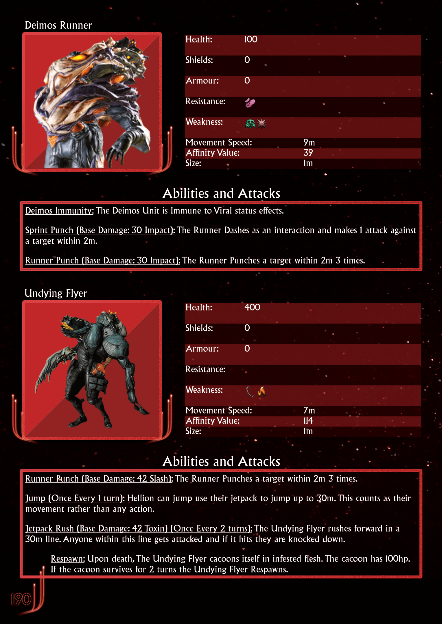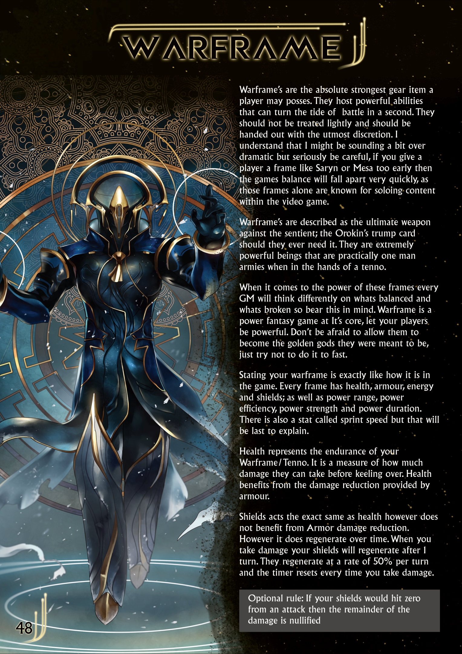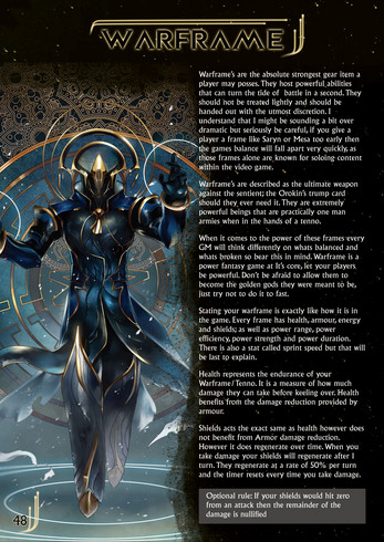 This fanmade Tabletop game wishes to emulate the fast paced, constantly engrossing, action of Warframe into a Tabletop playable format. This allows players to create their own stories and their own missions within the space of Warframe, with rules that support it fully.