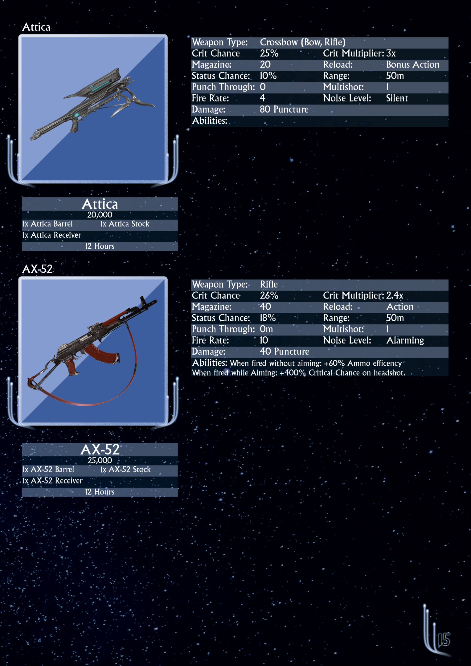 -Putting the weapons and mods into their own docments was smart, but i feel like some of the more advanced options could follow suit. Things that players aren't going to have easy access to until later in the game, like arcanes, necramechs, helminth, rivens (if they have to exist), etc. You could easily break up the "core" rulebook into "basic" and "advanced" books. You could also put the narmer/murmur/sentient factions in the advanced book, given they dont show up until later on in the original game's story.